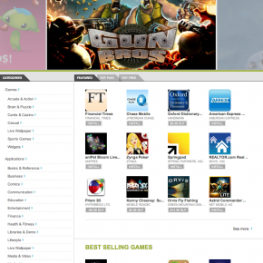 A search bar sits at the top of the site and beneath it, a carousel of featured apps dominates the page. Just below are three sections displaying the top Android top apps. Categories are divided and listed under games and applications in a left sidebar. It’s very reminiscent of iTunes.