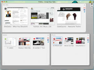 Each group displays thumbnails of open tabs, can be resized, and given a name. Users can drag and drop tabs into existing groups, start a new tab group, close tabs, or open a new tab. Ideally, one could have social networks running in one tab group and work sites running in another. Panorama is hands down one of the most useful features of Firefox 4 for power users!