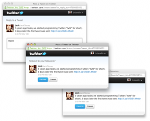 To get started with Twitter web intents you’ll need to embed a small SCRIPT tag on the pages you wish to enable web intents. Twitter has provided a zip file of icons for Twitter Web Intents. If you’re using the Twitter ReTweet button or WordPress’s Blackbird Pie, you’re already Web Intent compatible.